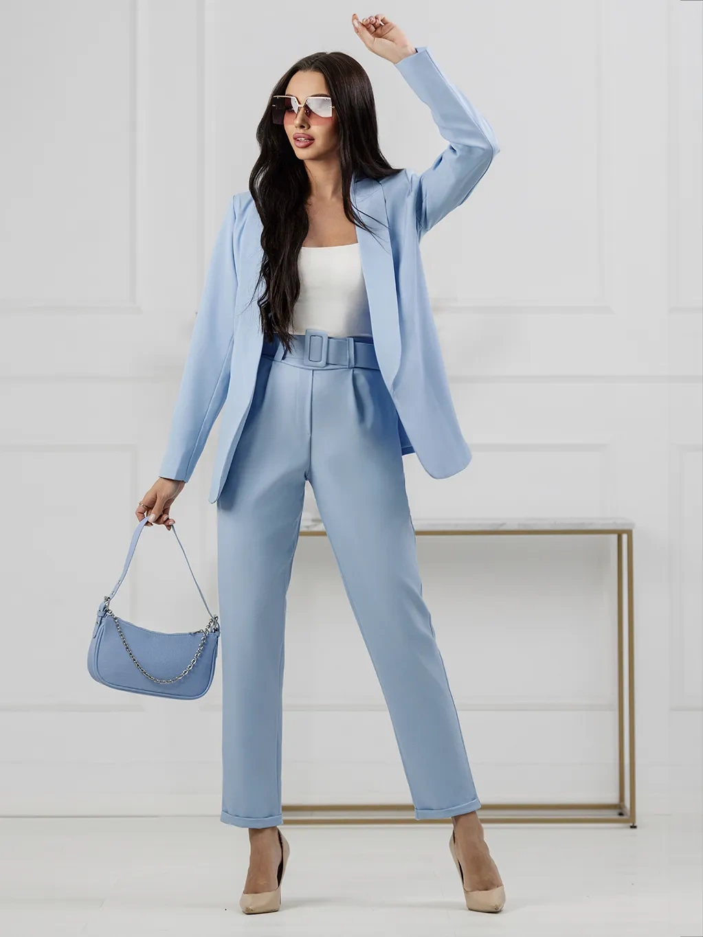 - Elegancko i biznesowo: Połącz go z białą jedwabną bluzką lub klasyczną koszulą. Dodaj szpilki w kolorze nude lub błękitnym dla uzyskania efektu total look, który optycznie wydłuża sylwetkę.